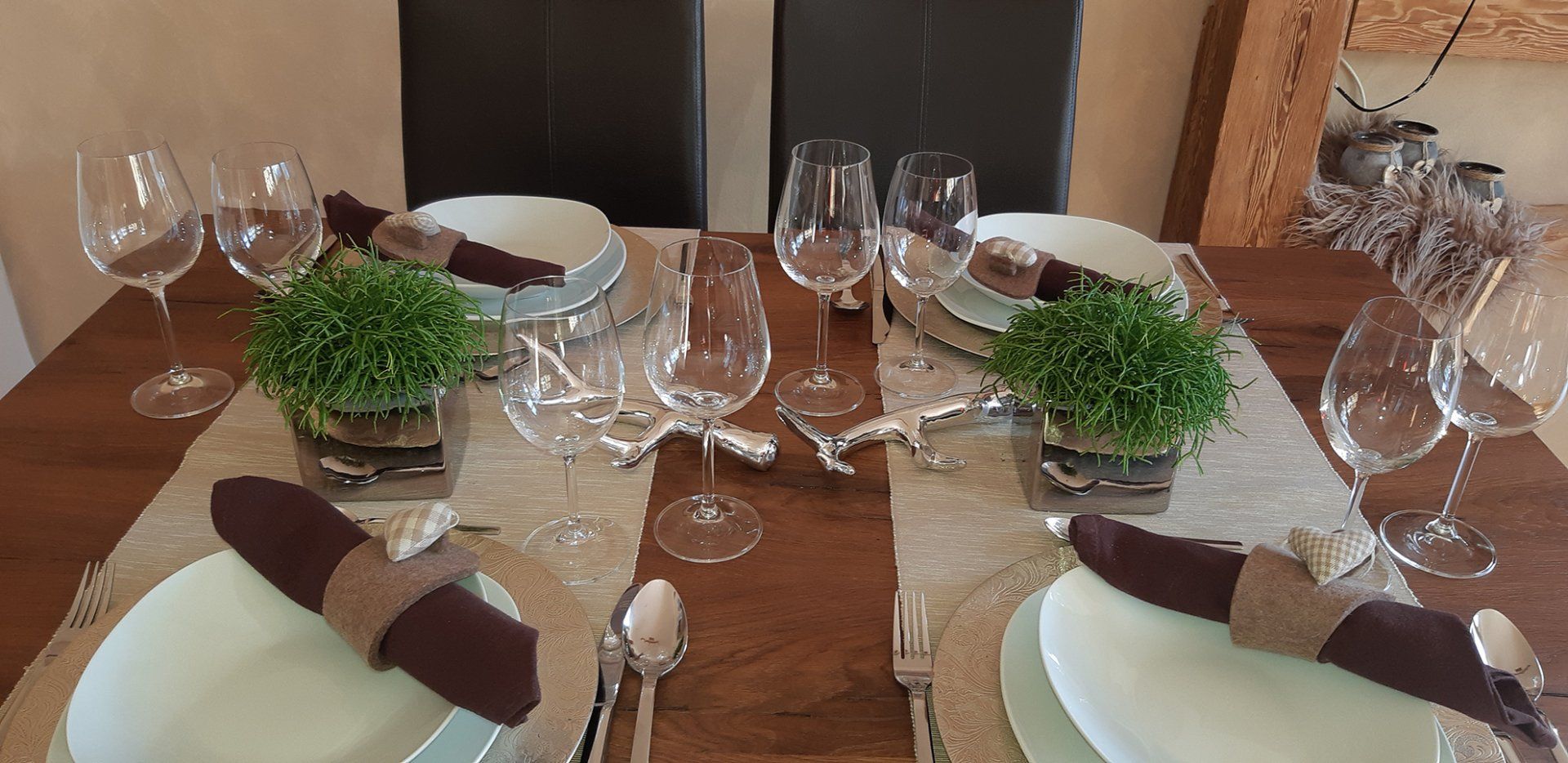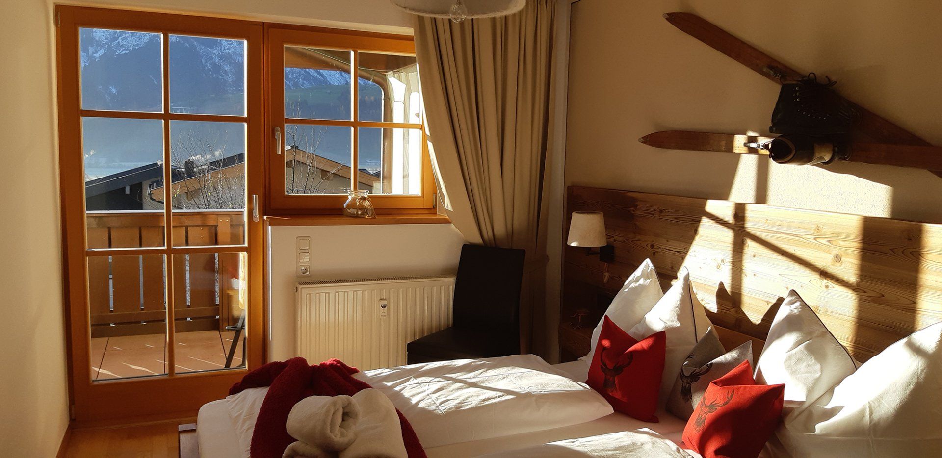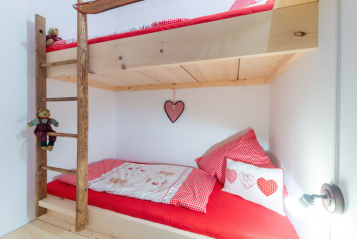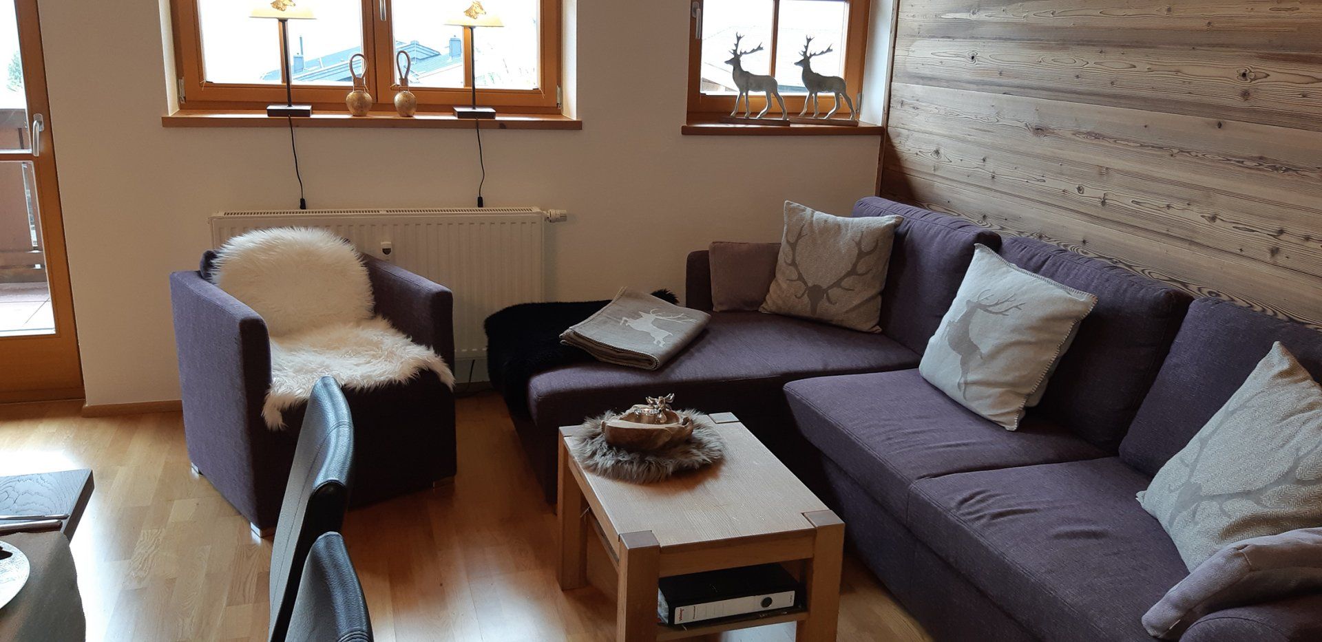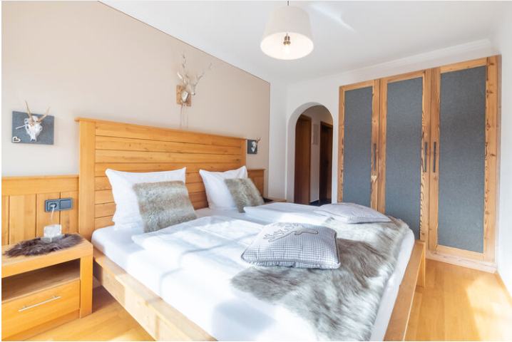 Die geräumige Ferienwohnung ist im alpenländischen Chalet-Stil gemütlich und funktionell eingerichtet. Sie besitzt u. a. zwei große Schlafzimmer mit Doppelbetten und ausreichend Schränke, zusätzlich in einem kleinen separaten Raum zwei kuschelige Stockbetten, zwei große Badezimmer mit Fön und zwei separate WCs.